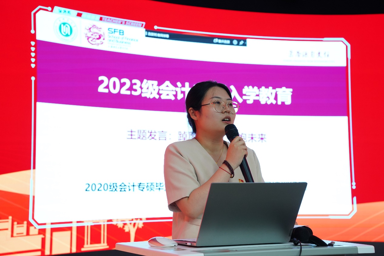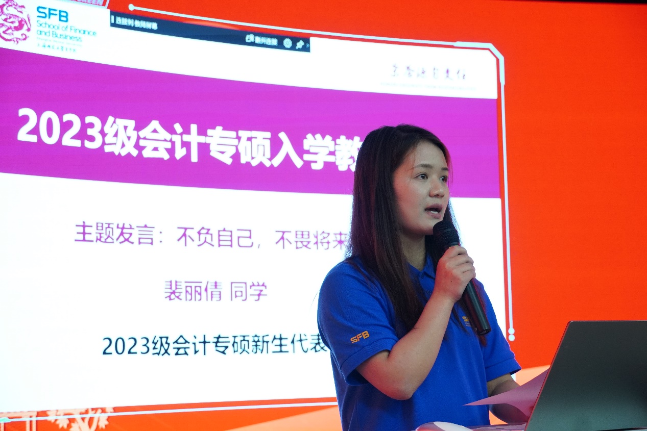 2023级会计专硕裴丽倩作为新生代表发言。首先,介绍了自己的学习经历以及选择俄罗斯专享会官网的原因,对即将到来的研究生生活寄予憧憬。然后,表明自己在以后的学习生活中要利用好学校的平台、师资等来充实自己,做好榜样。最后,引用校训中“笃行”一词,鼓励大家“不负自己,不畏将来”。