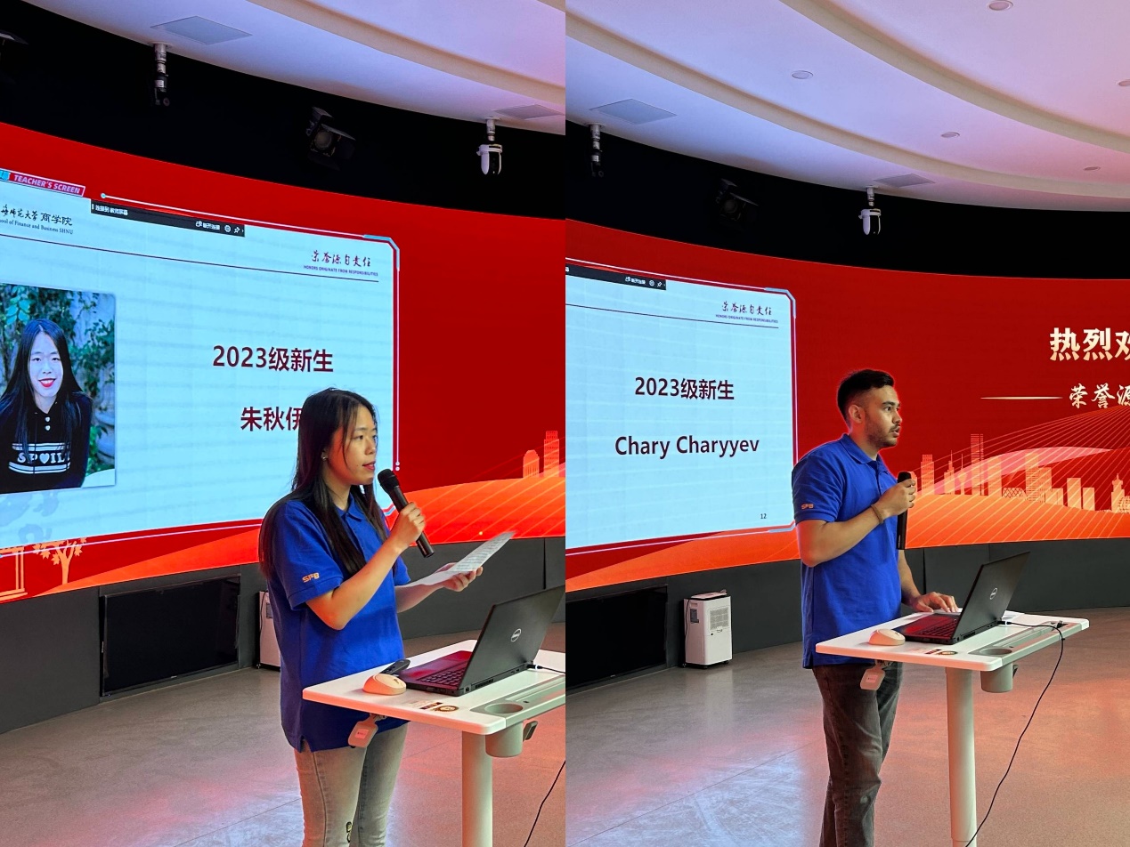 在接受学长学姐的经验分享后,新生代表朱秋伊与国际新生Chary Charyyev上台发言,他们表达了对未来学术和职业生涯的期待,以及对学术探索的热爱。